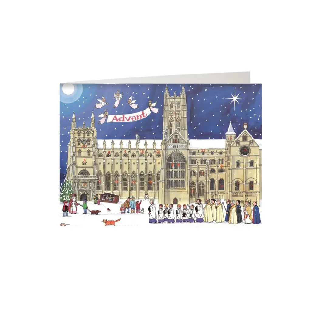 A smaller version of the ‘Christmas at the Cathedral’ advent calendar. This card features Cathedral at Christmas time scene, with St Nicholas handing out golden coins to excited children and a cathedral procession. Open each window-shaped door to look inside the cathedral at its most festive time of year. Makes a great card to post to a loved one during the festive season.